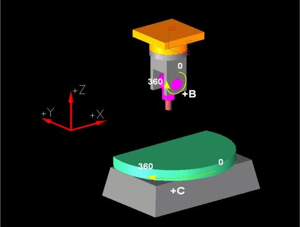 兩個旋轉軸均屬擺頭類,B 軸旋轉平面為 ZX 平面,C 軸旋轉平面為 XY 平面。