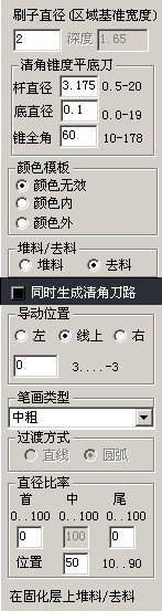 菜單提供的選項中,刷子的大小決定清角范圍的寬度,同時刷子大小和刀具參數(shù)決定清角的深度(在進行相關參數(shù)調整的時候深度會自動作出相應的調整)